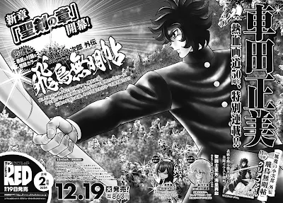 - O grande destaque desta edição é a continuação do mangá Fuuma no Kojiro Gaiden: Asuka Mumyouchou, focado no personagem Asuka Musashi. Além de ter seu terceiro capítulo publicado, com página de abertura colorida, o spin-off de Fuuma no Kojiro será a capa da edição de dezembro da revista. Também foi anunciado que para comemorar os 50 anos de carreira do mangaká Masami Kurumada, o gaiden de FnK será destaque em duas edições consecutivas da Champion RED;